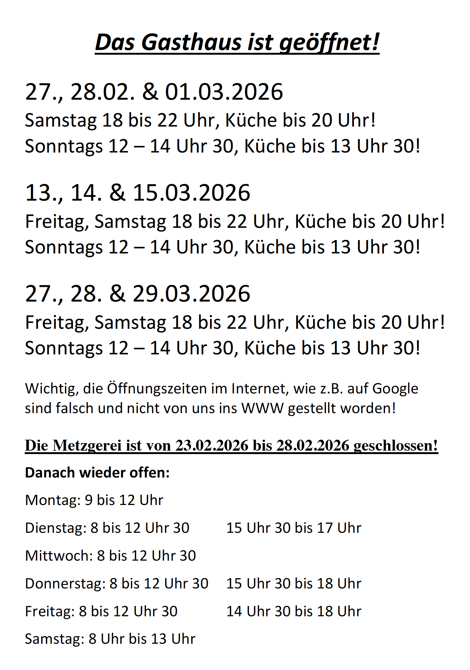 Angebot gültig so lange der Vorrat reicht. Für Druckfehler keine Haftung! Alle Spezialitäten bitte vorbestellen! Reservierungen und Bestellungen sind online nicht möglich, bitte kontaktieren Sie uns telefonisch unter Tel.: 06355 – 14 56.